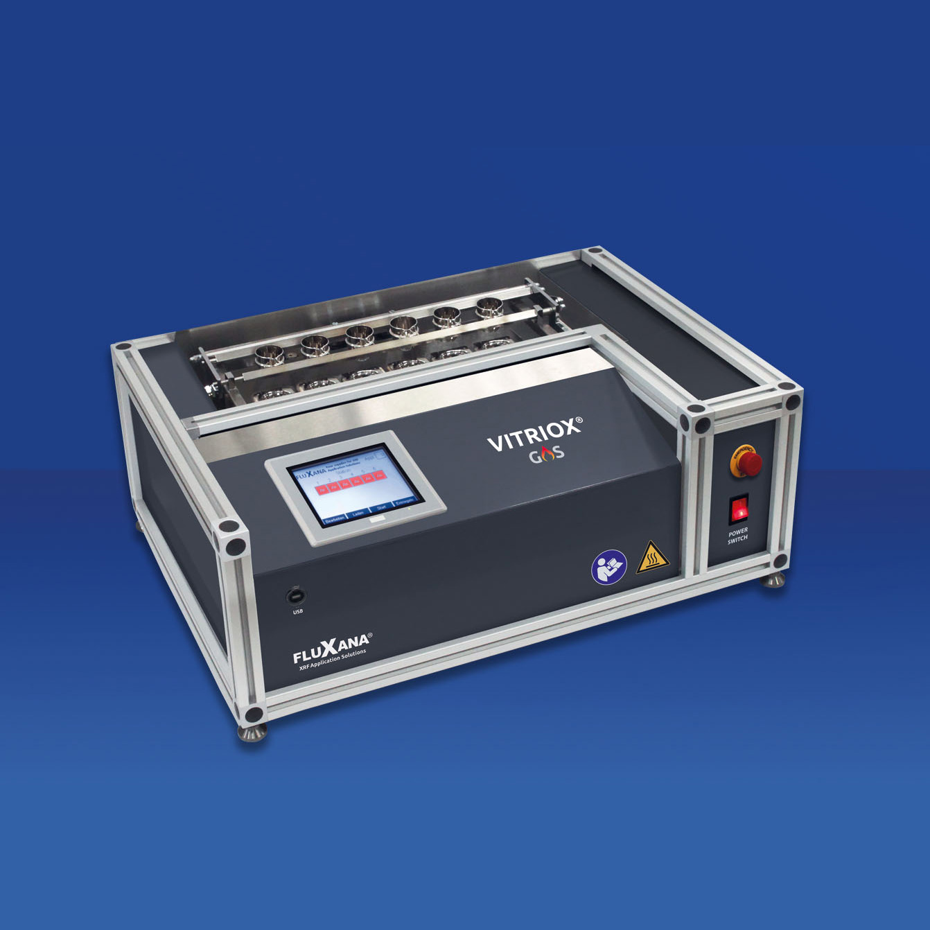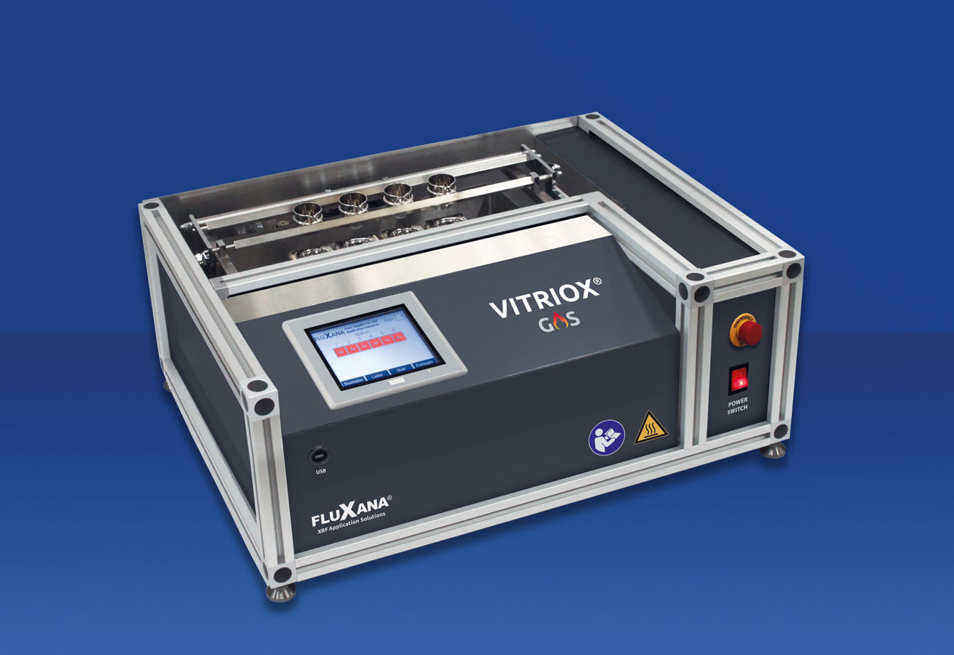 La perlatrice automatica VITRIOX® GAS di FluXana è una macchina per la fusione del campione a gas che gestisce il processo da freddo a freddo di fino a 6 posizioni contemporaneamente.