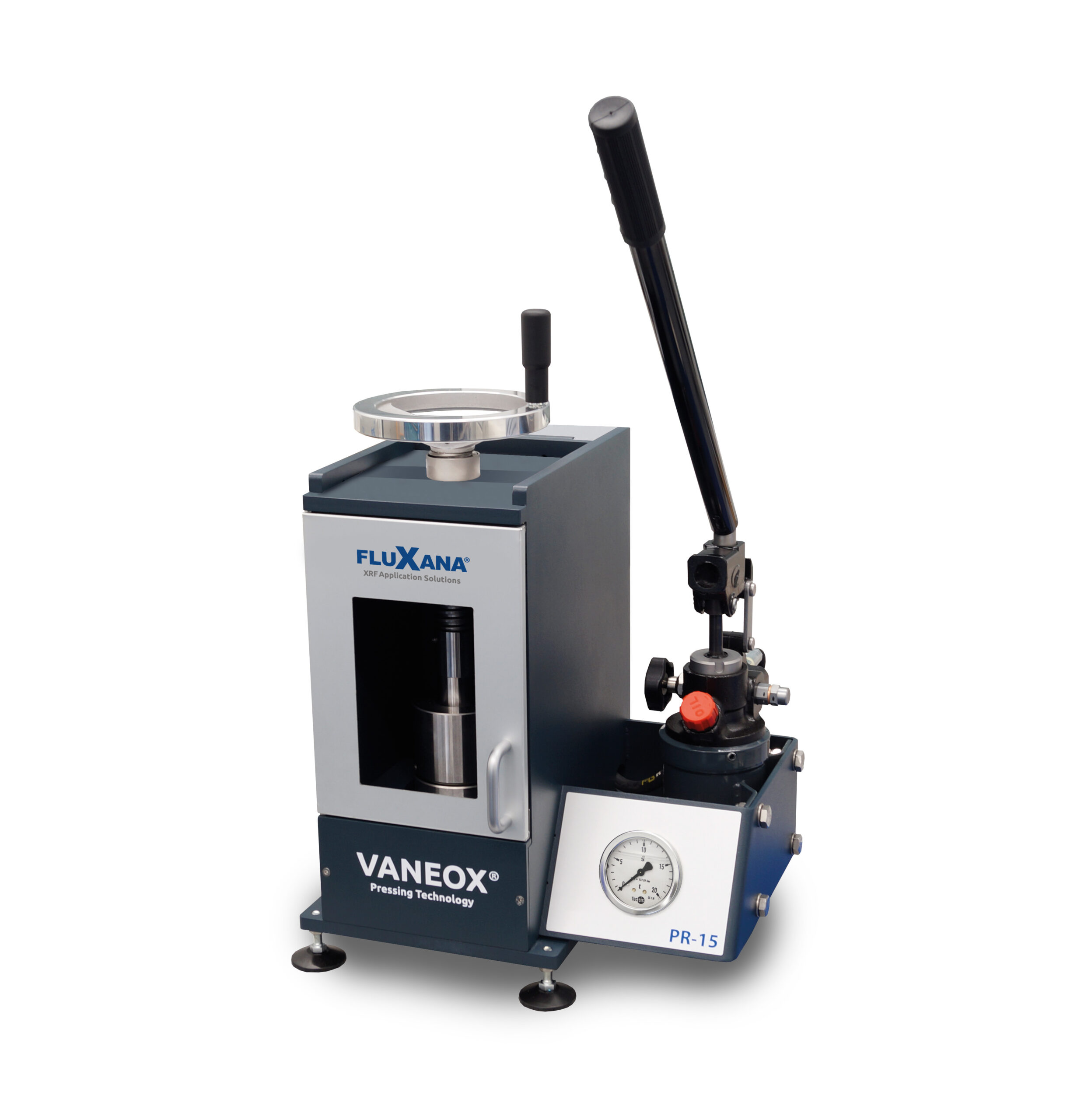 La pressa manuale VANEOX® 15t di FluXana è dotata due posizioni della leva che possono essere utilizzate per esercitare la pressione. Consente di utilizzare i classici stampi per le più comuni tecniche di preparazione ad esempio 32mm, 40mm e anelli da 40/32mm e 51,5/35.